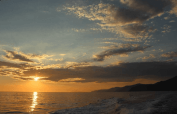 Die Überfahrt ist bereits ein Highlight: Erleben Sie den Sonnenuntergang über Punta Mesco, die Küste der Cinque Terre und Corniglia, das im Abendlicht wie eine schwebende Krippe wirkt.