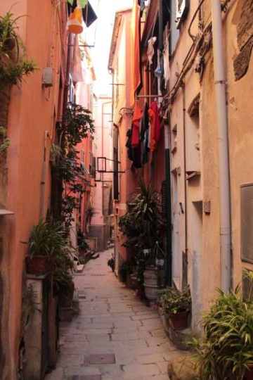 Connaissant par coeur mon village, Vernazza, afin d'éviter les foules de touristes dans la rue principale, nous avons pris l'allée latérale à droite de la gare, Via Del Santo, et nous avons traversé les portes pittoresques, les fenêtres fleuries et les vêtements qui sèchent au soleil dans mon allée préférée, une fois connue sous le nom de l'Caruggio Axeu (ruelle de vinaigre), qui va mène au début du chemin de randonnée.
