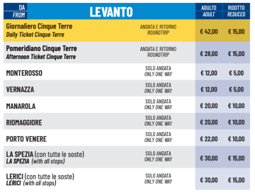 I biglietti giornalieri costano 42 € (15 € per i bambini dai 6 agli 11 anni) e comprendono imbarchi illimitati tra i cinque borghi e Porto Venere.